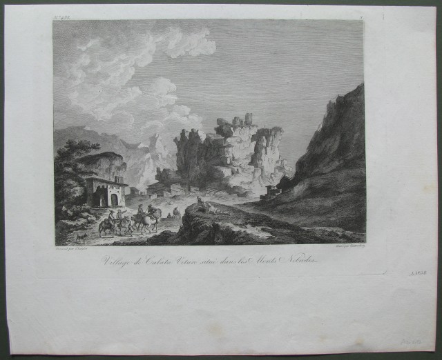 (Sicilia) CALATA VETURO, monti Nebrodi. Bella veduta generale del villaggio con gruppo di cavalieri in primo piano, mm 229x165 più margini. Incisione all'acquaforte realizzata su carta vergellata tratta dall'edizione del 1836 dell'opera dell'abate di Saint-Non VOYAGE PITTORESQUE A NAPLES ET EN SICILE. Si trova tuttora in ottima e fresca conservazione. (Rif.A1578-307/39)