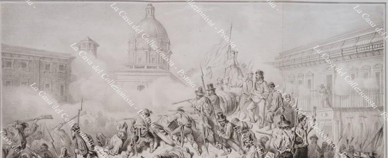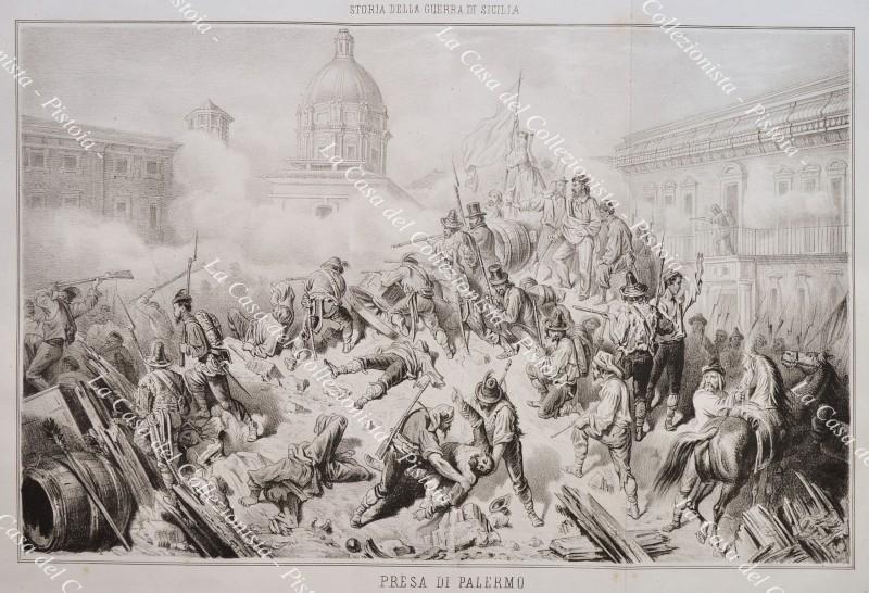 Sicilia. PRESA DI PALERMO. Grande litografia di mm 365x240 più ampi margini. Tratta dall'opera di Domenico Valente "Storia della Guerra di Sicilia", stampata in Napoli da Morelli nel 1862. Più volte ripiegata all'origine. Ottima conservazione. (Rif.D8344)
