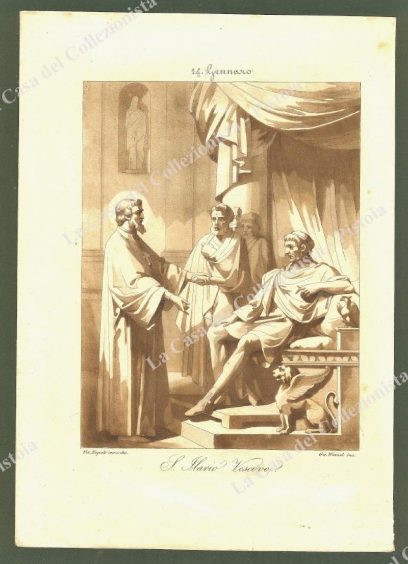 S.ILARIO VESCOVO. Prottetore Parma. Bella tavola assai fine e curata, incisa all’acquatinta in color seppia da Wenzel su disegno di F.Bigioli è tratta da "Il perfetto leggendario ovvero vite de’ Santi per ciascun giorno dell’anno”, opera edita in Roma attorno al 1840. Misura mm 184x264 ai margini e impressa su carta grave. Piccoli punti d'ingiallimento. (Rif.A456-608/36)