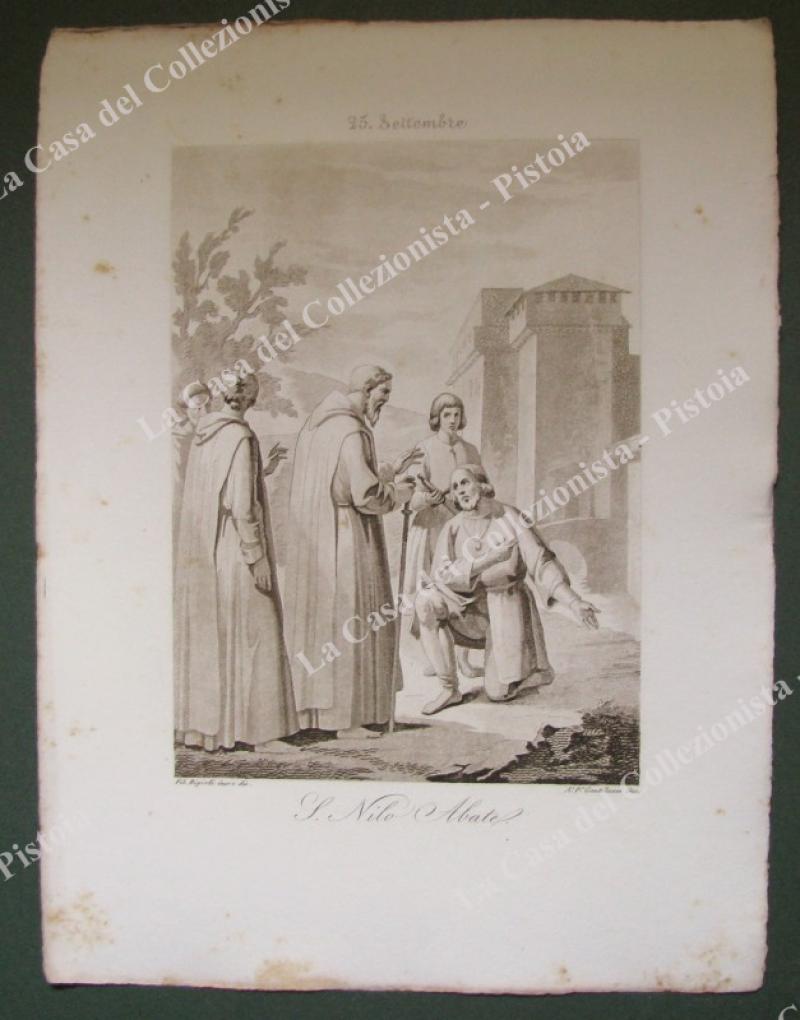 S.NILO ABATE, Patrono di Rossano e Grottaferrata. Bella tavola assai fine e curata, incisa all’acquatinta in color seppia da Gentilucci su disegno di F.Bigioli è tratta da "Il perfetto leggendario ovvero vite de’ Santi per ciascun giorno dell’anno”, opera edita in Roma attorno al 1840. Misura mm 207x271 ai margini e impressa su carta grave. Ingiallimenti. (Rif.E2886)