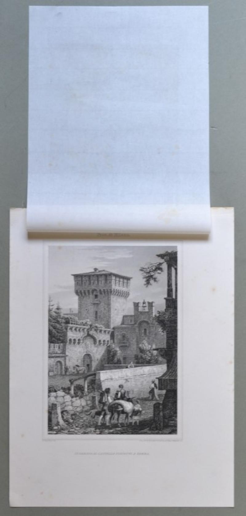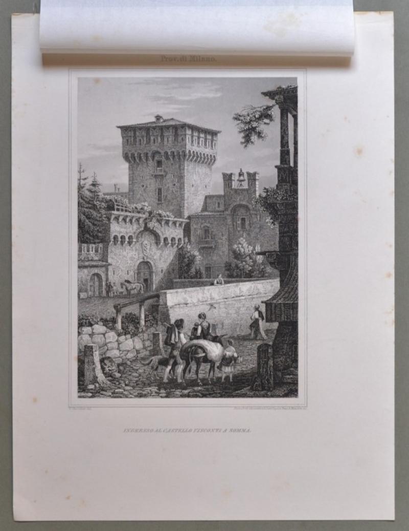 SOMMA, Lombardia.“Ingresso al castello Visconti a Somma”. Deliziosa veduta con personaggi in primo piano. Mm 132x193, ai margini 230x310. Finissima incisione, protteta da velina, tratta da ALBUM VON ITALIEN edita a Trieste dal Lloyd Austriaco attorno al 1855. (Rif.D4125 - 208/68)