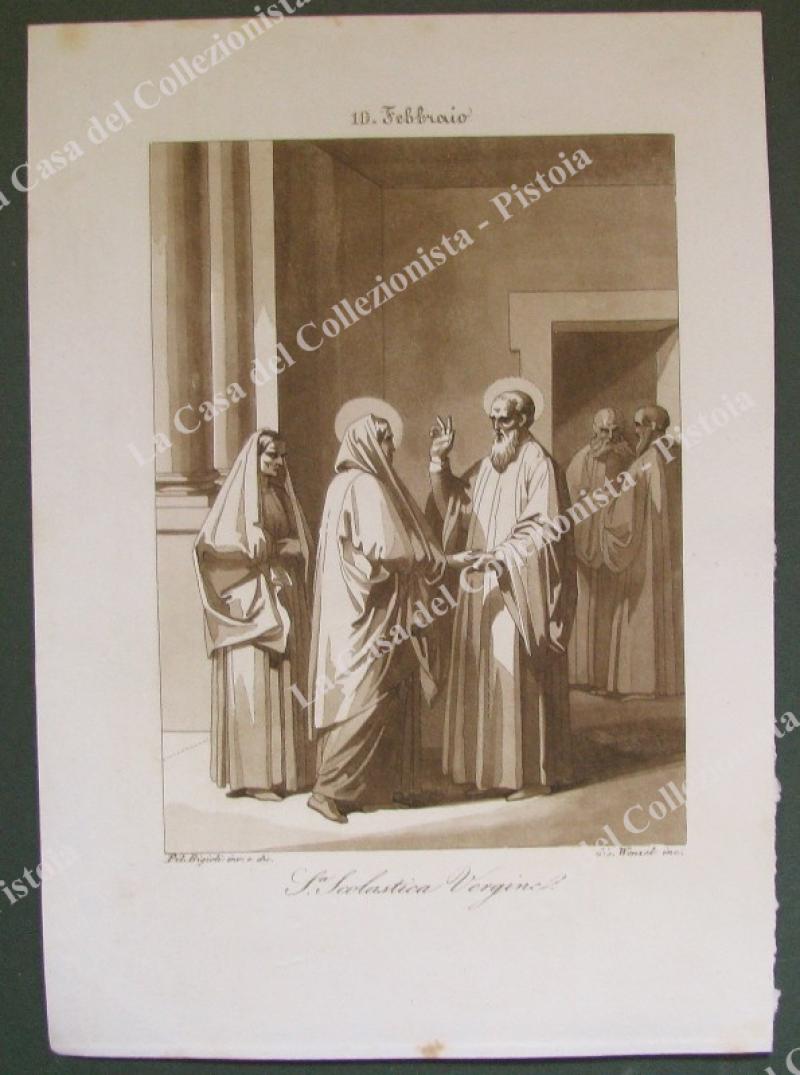 S.ta SCOLASTICA DA NORCIA VERGINE, Patrona dell'ordine delle monache benedettine. Bella tavola assai fine e curata, incisa all’acquatinta in color seppia da Wenzel su disegno di F.Bigioli è tratta da "Il perfetto leggendario ovvero vite de’ Santi per ciascun giorno dell’anno”, opera edita in Roma attorno al 1840. Misura mm 187x263 ai margini e impressa su carta grave. (Rif.E2904)