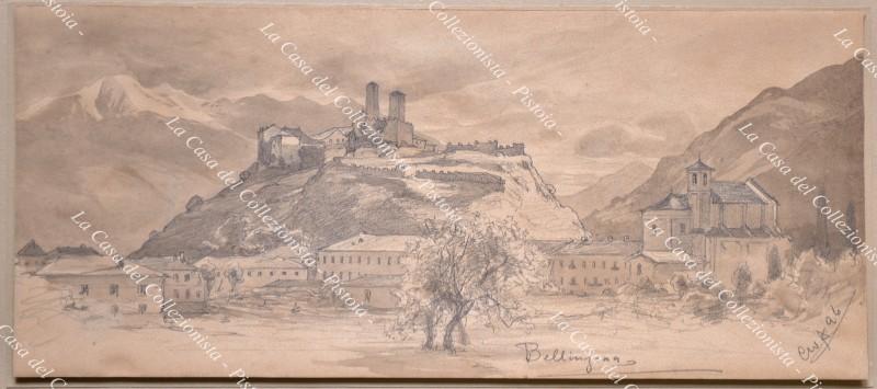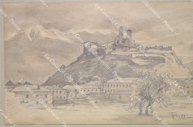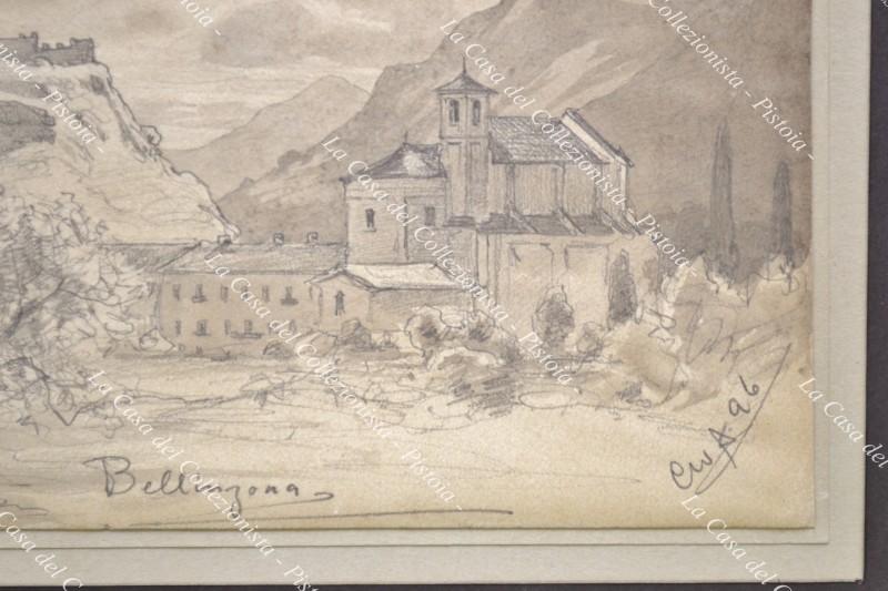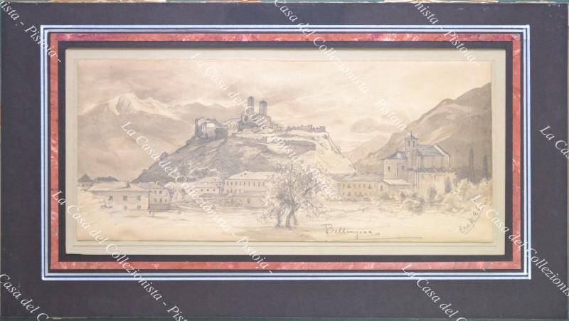 SVIZZERA. “Bellinzona”. Veduta generale realizzata a matita e a china da Christian Wilhelm Allers (Amburgo 1857 – Karlsruhe 1915) disegnatore, pittore e illustratore. Il disegno è firmato e datato 1896 in basso a destra. Misura mm 365x158 ed è parzialmente incollato su cartoncino. Buona conservazione. (D9179-327/72)