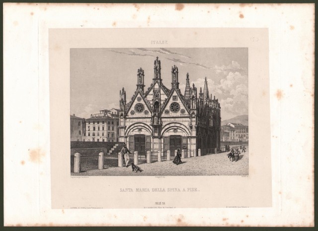 TOSCANA. PISA. Santa maria della Spina a Pise. Finissima incisione all'acquatinta su velina applicata su carta forte tratta da un dagherrotipo. Incisione di Salathà e impressa da Bougeard. Mm 206x187 (ai margini mm 360x260). Circa 1850. Qualche ingiallimento sui margini bianchi. Rara. (Rif.C7259)