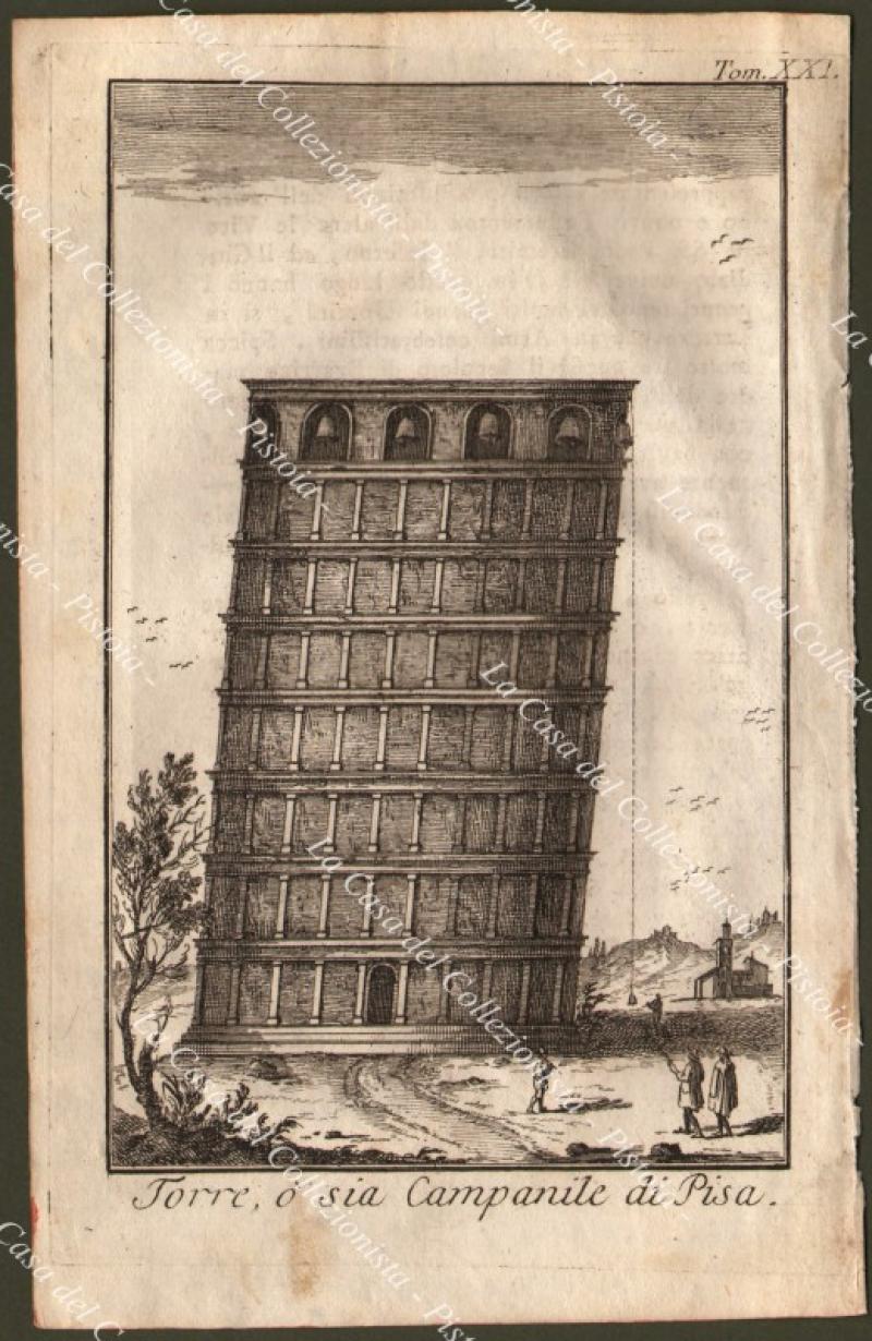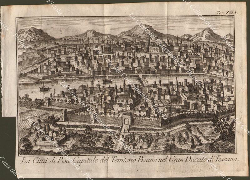 Toscana. PISA. La Città di Pisa Capitale del Territorio Pisano nel Gran Ducato di Toscana. Incisione, realizzata con la tecnica dell'acquaforte, tratta dall'opera "Lo Stato di tutti i Paesi e Popoli del Mondo Naturale, Politico e Morale con nuove osservazioni e correzioni degli Antichi e Moderni Viaggiatori scritto in inglese dal Signor Thomas Salmon", stampata in Venezia, presso Giambattista Albrizzi, anno 1757. Mm 220x140 più margini. UNITA (stessa provenienza) altra veduta di mm 100x157 più margini: Torre, o sia Campanile di Pisa. (Rif.D8276)