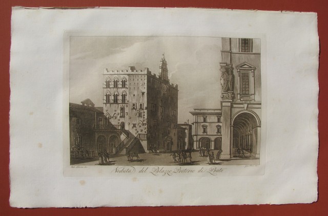 Toscana. PRATO. Veduta del Palazzo Pretorio di Prato Splendida e decorativa incisione fuori testo realizzata con la tecnica dell'acquatinta. Misura mm 344x229 più margini (complessivamente mm 565x360). Proviene dall'opera Viaggio Pittorico della Toscana, edita in Firenze presso Giuseppe Tofani e uscita in tre volumi tra il 1801 e il 1803. Viene unita la pagina originale che conteneva la descrizione della tavola. Ottima e fresca conservazione. (Rif.B1519)