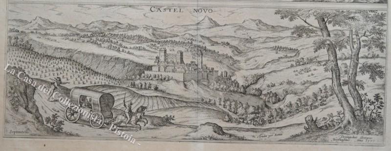 UMBRIA - LAZIO. NOCERA – CASTELNOVO. 1580 circa, Braun Hogenberg. Intera tavola (mm 555x415) contenente due splendide vedute incise all’acquaforte ciascuna di mm 480x173: "NOCERRA in Appennino Monte” - 2) "CASTEL NOVO”. Ottima conservazione. (Rif.D1629-274/65)