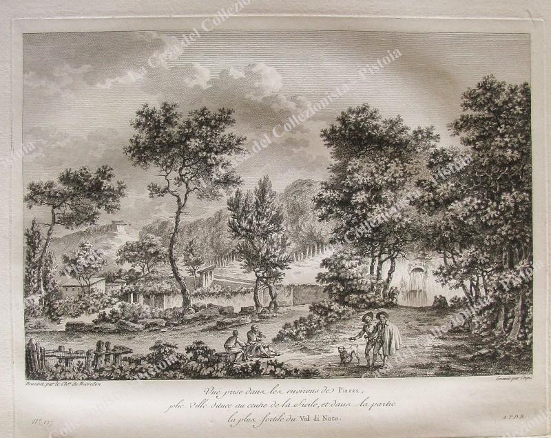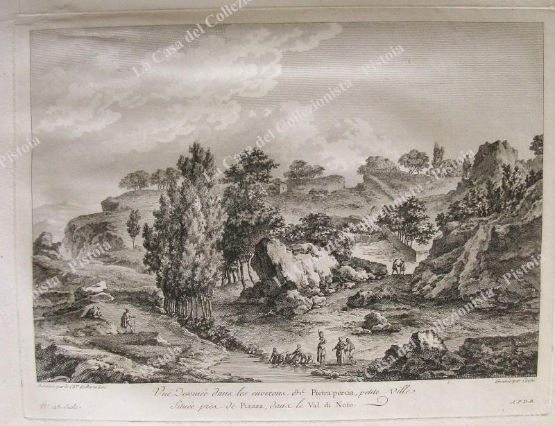 VAL DI NOTO, Sicilia. Due vedute animate prese nei dintorni di Pietrapersa e Piazza. Da Saint Non, prima edizione Parigi 1781. Acquaforte di mm 242x165 e di mm 242x172 in foglio di mm 340x530. Buona conservazione. (Rif.F0152)