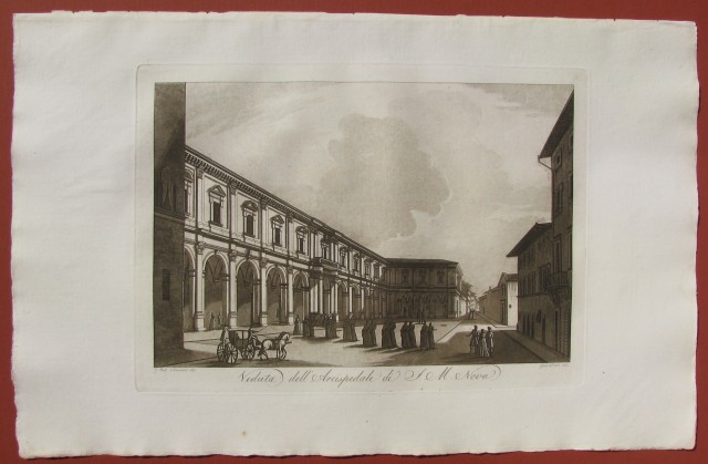 Veduta dell'Arcispedale di S.M. Nova. Splendida e decorativa incisione fuori testo realizzata con la tecnica dell'acquatinta. Disegnata da Antonio Terreni ed incisa da Giuseppe Pera. Misura mm 342x229 più margini (complessivamente mm 565x360). Proviene dall'opera Viaggio Pittorico della Toscana, edita in Firenze presso Giuseppe Tofani e uscita in tre volumi tra il 1801 e il 1803. L'abate Francesco Fontani curಠil testo e l'edizione. Viene unita la pagina originale che conteneva la descrizione della tavola. Ottima e fresca conservazione. (Rif.1696)