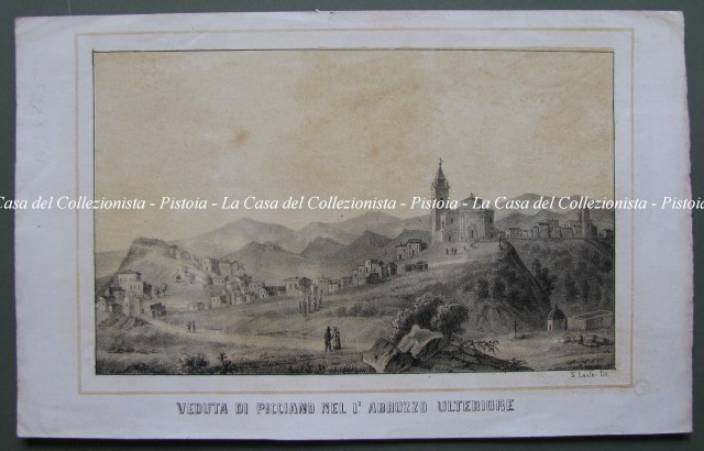 Veduta di Picciano nel I'° Abruzzo Ulteriore. Bella veduta generale. Finemente eseguita in litografia, nei colori nero e seppia, è stata stampata a Napoli attorno al 1855 da Cirelli e dalla Litografia del Poliorama. Decorativa e molto rara. Mm 245x152 (ai margini mm 320x200). Buona conservazione. (Rif.B7139-200/54)