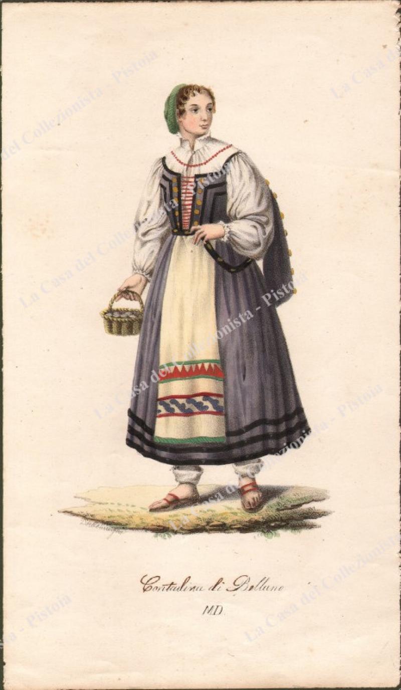VENETO - BELLUNO. "Contadina di Belluno del '500". Litografia in bella coloritura coeva (circa 1850). Mm 150x260. Ottima conservazione. (Rif.B9821-308/70)