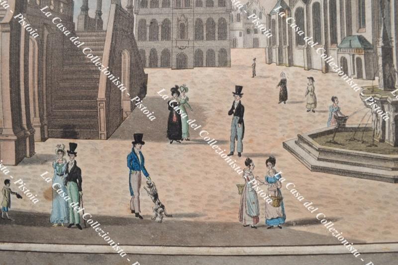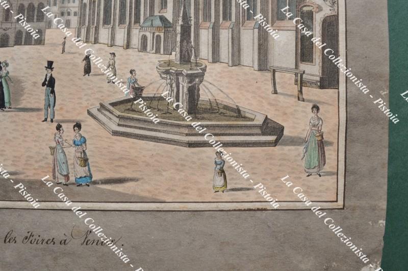 VENEZIA. PLACE, OU L'ON TIENT LES FOIRES A VENISE. Rara veduta d'ottica, databile nella seconda metà del 1700, con coloritura coeva. I personaggi sono stati aggiunti disegnandoli a mano. La parte incisa è stata all'epoca rifilata ed incollata su altro foglio con margini acquarellati e titolo manoscritto alla base. Misura cm 38x24,5 più margini (complessivamente cm 43,5x32). Piccole lacune di colore sui margini dovute a modeste abrasioni, ottimo aspetto. (Rif.F7419-77)