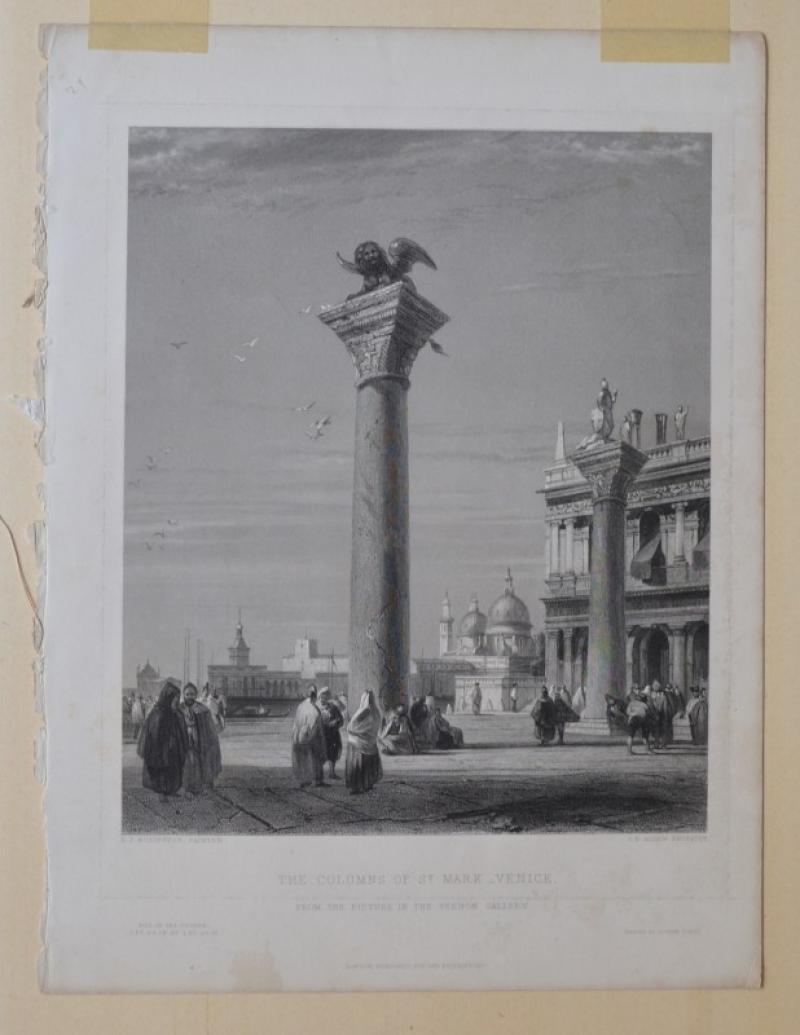 VENEZIA. "THE COLUMNS OF St MARK VENICE". Finissima incisione di J. B. Allen su disegno di Bonington. Londra, circa 1850. Misura mm195 x 235 (ai margini mm 235 x 315). Buona conservazione. (Rif.D2199)