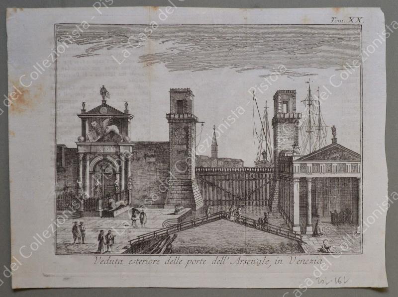 VENEZIA. Veduta esteriore della porta dell'Arsenale in Venezia. Salmon, edizione di Venezia, 1753. Acquaforte di mm 198x150 più margini. Tavola ripiegata (proviene da libro). Conservazione buona, ossidazione sul bordo bianco sinistro. (Rif.F6281)
