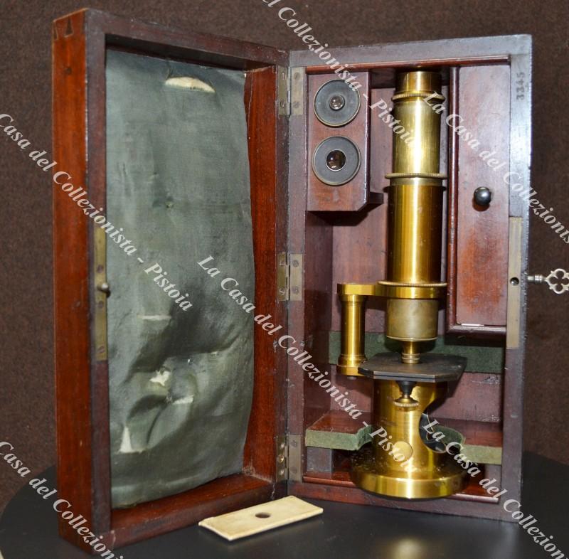 MICROSCOPIO ANTICO in ottone, non siglato, circa 1890.