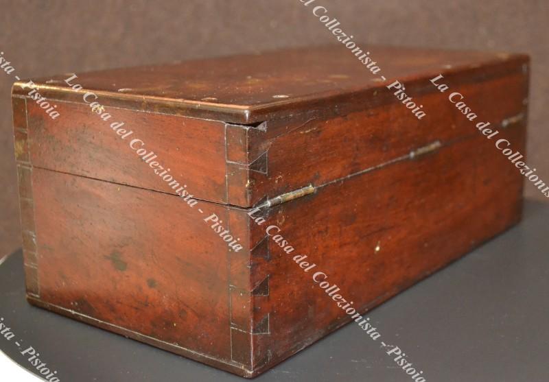 MICROSCOPIO ANTICO in ottone, non siglato, circa 1890. Alloggiato dentro la custodia originale in legno con due scomparti per l’alloggio degli oculari (presenti) ed un cassettino di servizio. Monta un obbiettivo, la messa a fuoco è manuale. (Rif.F6400-157/76)