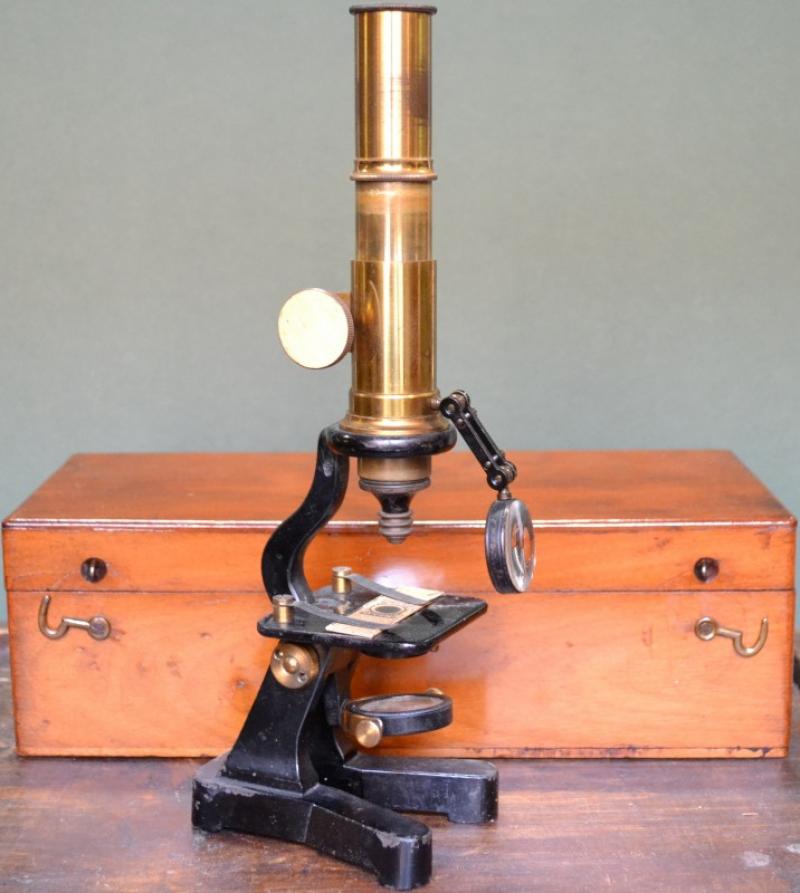 MICROSCOPIO in ottone databile alla fine dell’800, dotato di specchietto e di lente d’ingradimento per convogliare la luce verso l’oggetto da esaminare. Collocato nella bella custodia originale in legno (cm 30x13x10) con chiusure ad uncino. Presente un vetrino con campione, manca la pinzetta. Perfettamente fuonzionante. (Rif.F1083)