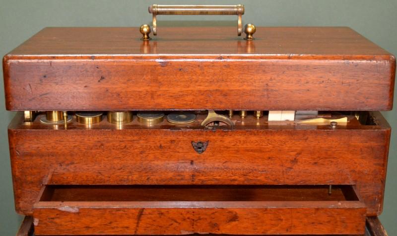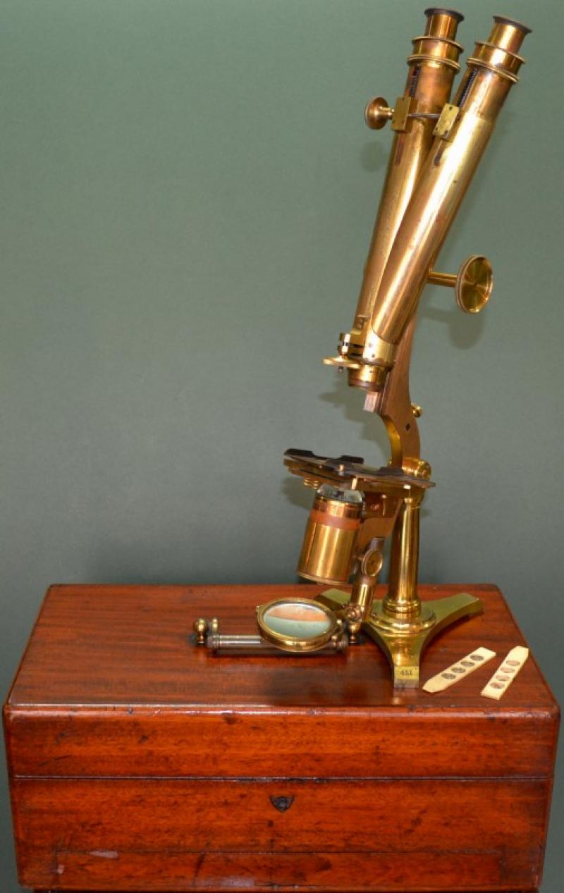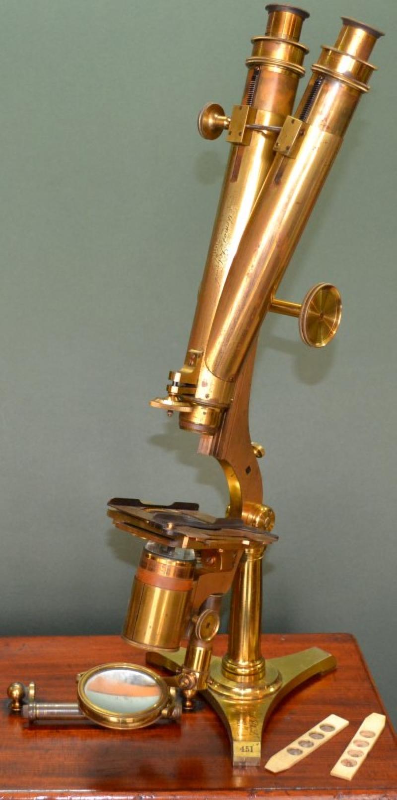 RARO MICROSCOPIO BINOCULARE, databile attorno al 1850 siglato alla base “SMITH & BECK 6 Coleman St London”. Realizzato in ottone e collocato disteso nella scatola originale in legno (cm 43 x cm 23,5 x 17,5 di spessore e dotata alla base di un cassetto apribile rimuovendo due fermi interni) dove sono presenti molti altri accessori posti nei rispettivi alloggi (quattro risultano vuoti). Il microscopio misura cm 54,5 alla massima estensione (retratto cm 39). Strumento fascinoso, raro e funzionante con solo normali segni del tempo. (Rif.F1102)
